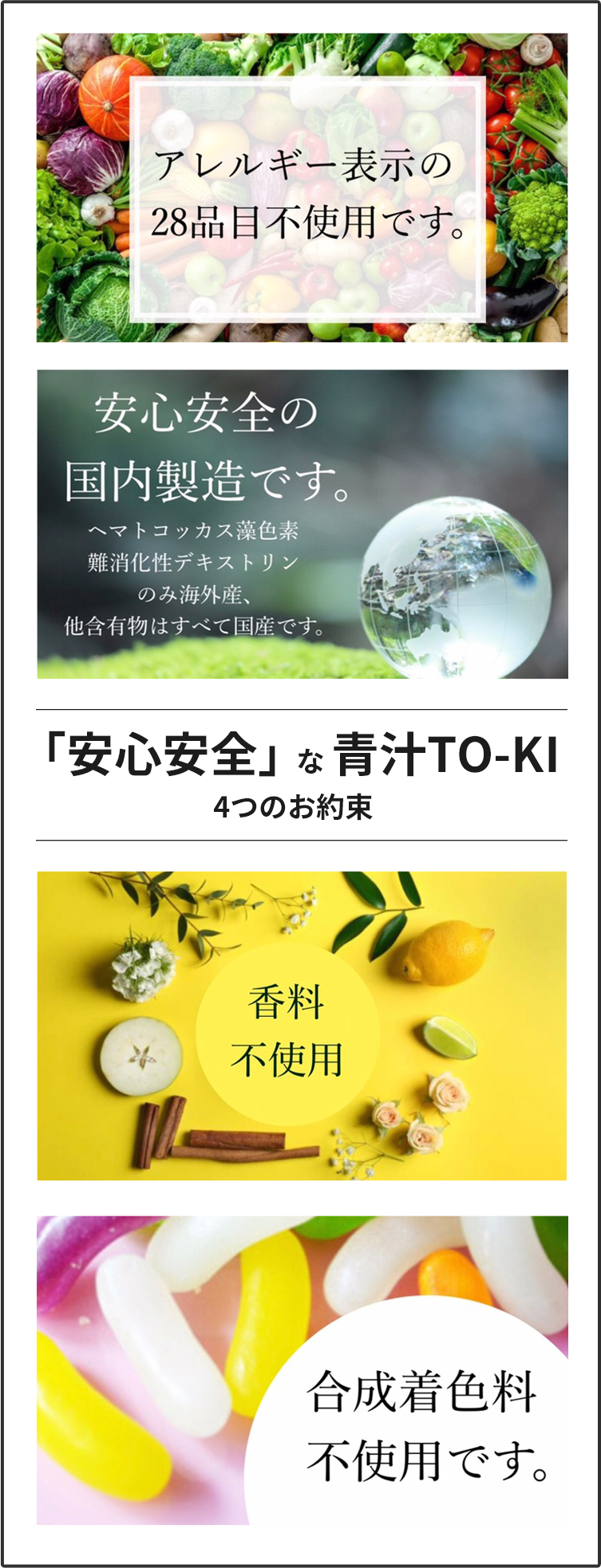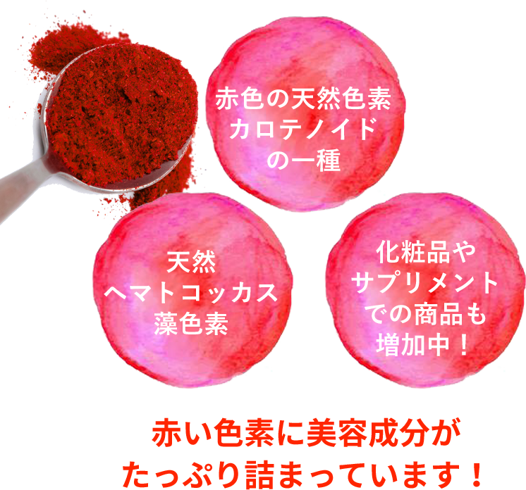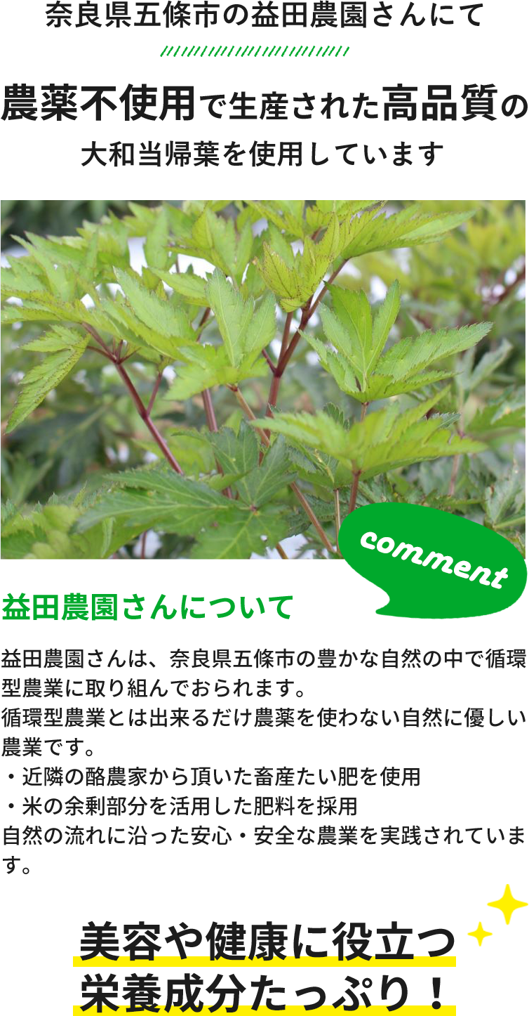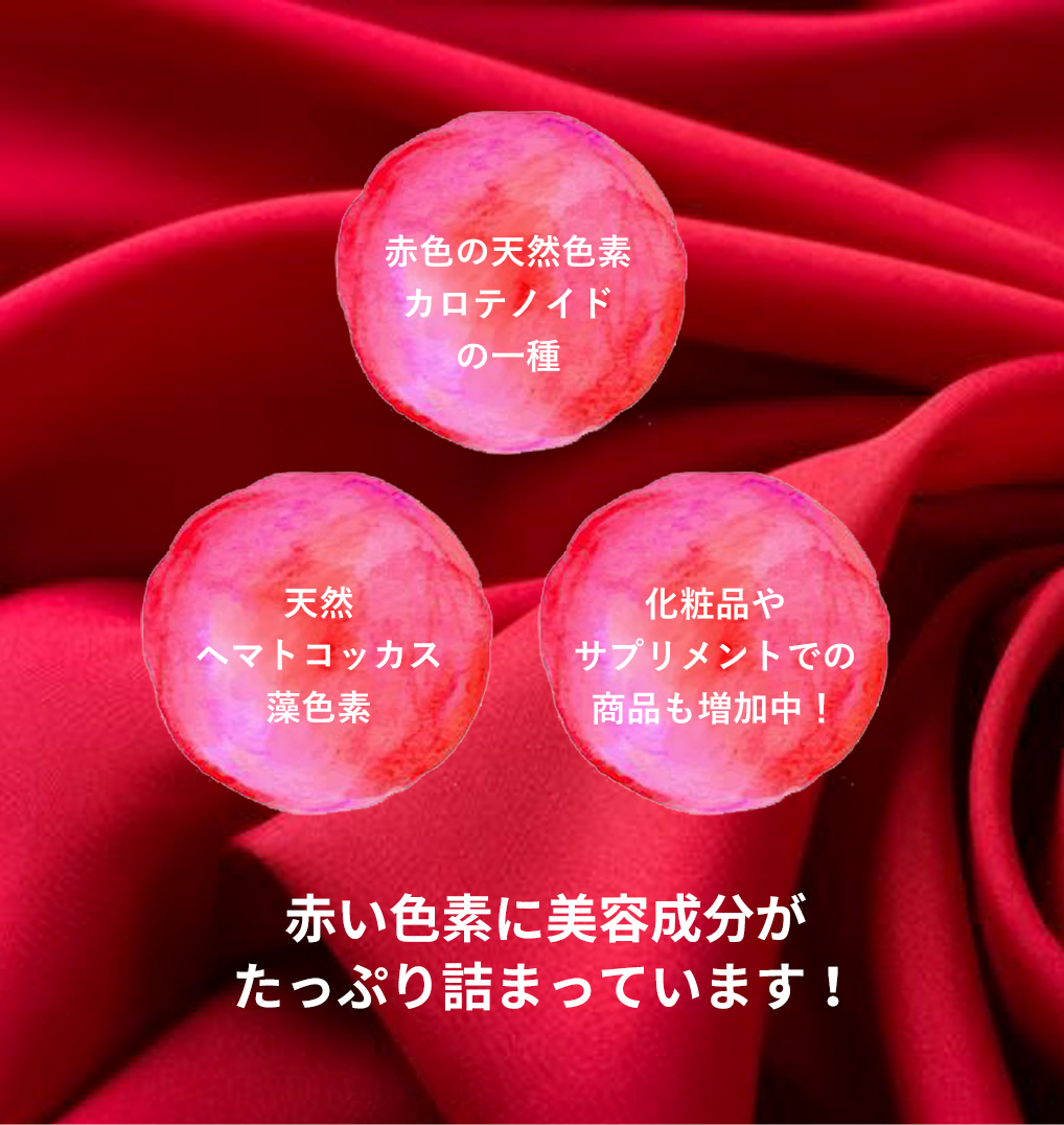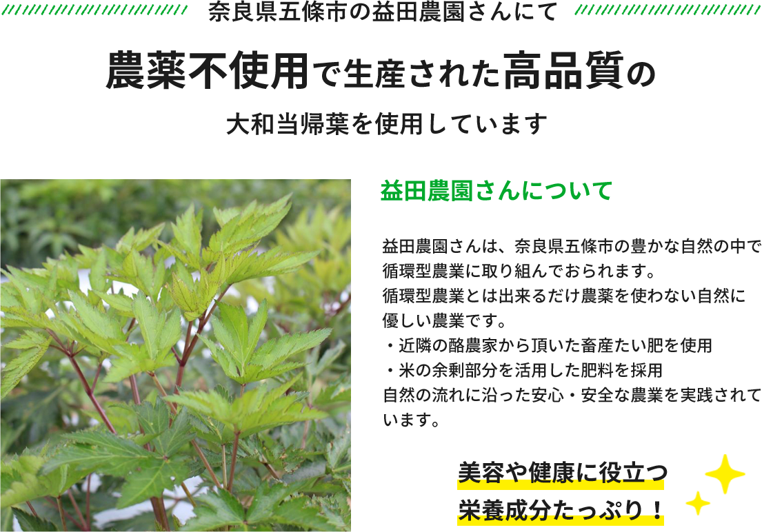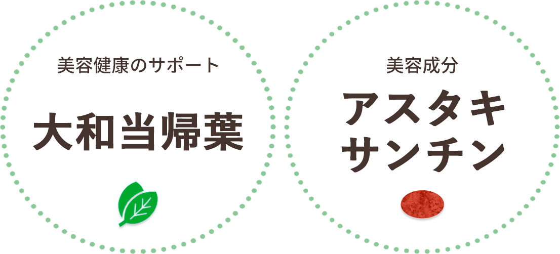 ⾼品質の⼤和当帰葉と天然⾊素である美容成分アスタキサンチンを配合。